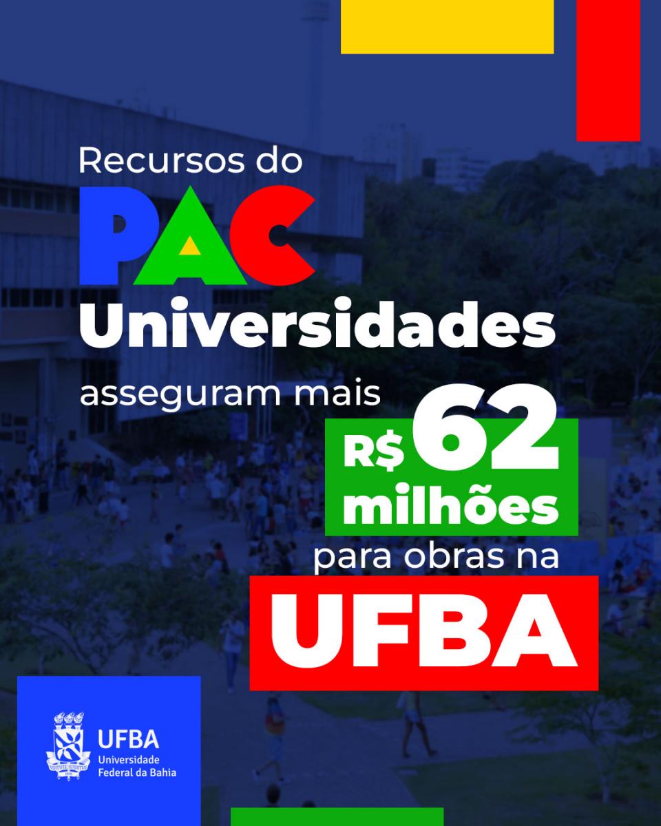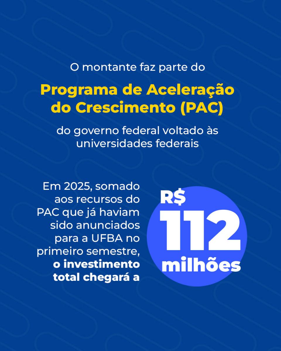 A UFBA receberá novos investimentos no montante de R$ 62 milhões do Programa de Aceleração do Crescimento (PAC) do governo federal voltado às universidades federais. Com os recursos do PAC que já haviam sido anunciados no primeiro semestre, o investimento total chegará a R$ 112 milhões neste ano de 2025.